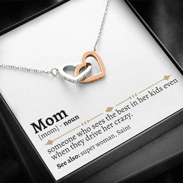 Two hearts embellished with Cubic Zirconia stones, interlocked together as a symbol of never-ending love. Made with high quality polished surgical steel. Cable chain measures 18 inches with a 4 inch extension, and fastens with a lobster clasp.Pendant Dimensions: • Height 0.6" (1.5cm)• Width 1.1" (2.7cm)• Adjustable cable chain 18"-22"